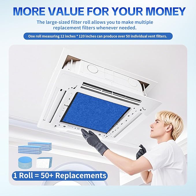 - 【Simple, Flexible Installation】Easily trimmed to fit vents of any shape or size, this filter roll works with floor, ceiling, wall, and window vents, as well as AC and HVAC grilles. Compatible with standard sizes like 4"x10", 4"x12", and even circular vents. Ideal for use as a fan filter, box fan filter, or various DIY air filtration applications.