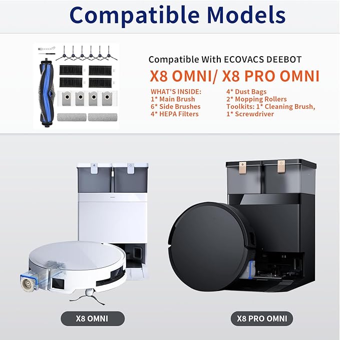 - COMPATIBLE WITH: This Accessories kit is perfectly compatible with ECOVACS DEEBOT X8 PRO OMNI Robot Vacuum. Please kindly check your vacuum cleaner model before purchasing.