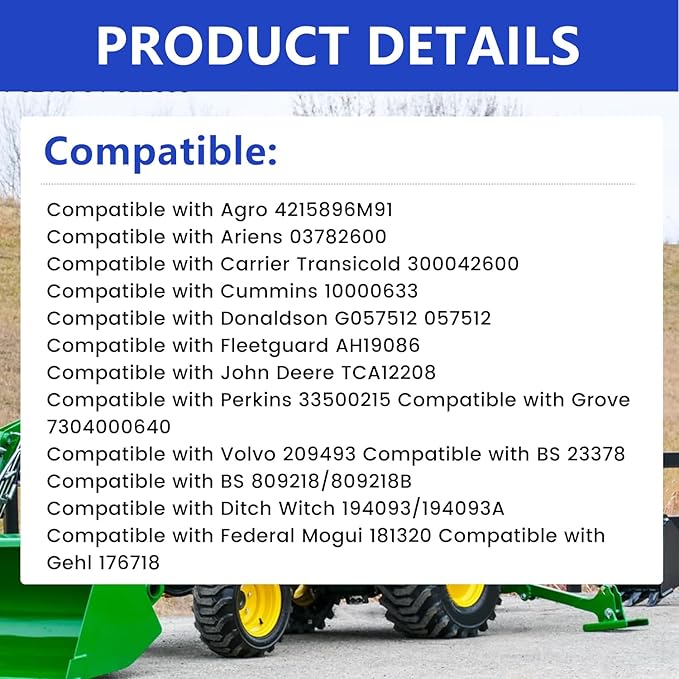 - 【VERSATILE COMPATIBILITY】- Compatible With: Agro 4215896M91, Ariens 03782600, Carrier Transicold 300042600, Cummins 10000633, Donaldson G057512 057512, Fleetguard AH19086, John Deere TCA12208, Perkins 33500215, Grove 7304000640, Volvo 209493, Briggs & Stratton 23378, Briggs & Stratton 809218/809218B, Ditch Witch 194093/194093A, Federal Mogui 181320, Gehl 176718, Compressors and generator sets, Construction and in-plant vehicles, On- and off-highway vehicles, Marine and offshore equipment.
