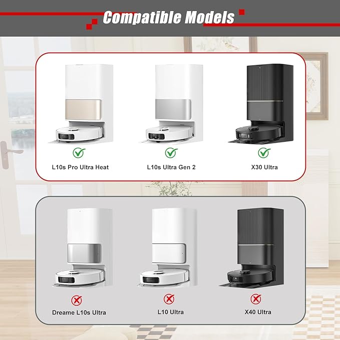 - Compatible Model:The accessories kit is compatible with Dreame L10s Pro Ultra Heat/L10s Ultra Gen 2/X30 Ultra Robot Vacuum. (Please check your robot vacuum model before purchasing!)