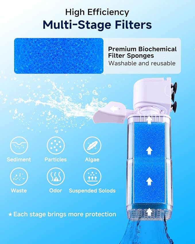 - 🔹IDEAL FOR 20-40 GALLON: Power 6W, Max flow 145GPH(550L/H). Our internal fish tank water filter is crafted with BPA/odor-free ABS armor to protect sensitive species. It's recommended to clean the aquarium filter sponge every 1~2 weeks for optimal operation.