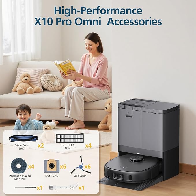 - ๐ใ๐ฃ๐ฟ๐ฒ๐บ๐ถ๐๐บ ๐ ๐ฎ๐๐ฒ๐ฟ๐ถ๐ฎ๐น๐ใOur replacement for eufy X10 Pro Omni replacement parts feature materials for exceptional performance. Rubber brush remove stains like hidden debris in carpets, including pet hair while protecting floors. The larger dust bag fits snugly, preventing leaks. High-absorbency cloths guard against water damage. Soft side brushes tackle dust in tight spaces. The filter eliminates 99.97% of particles as small as 0.3 microns.