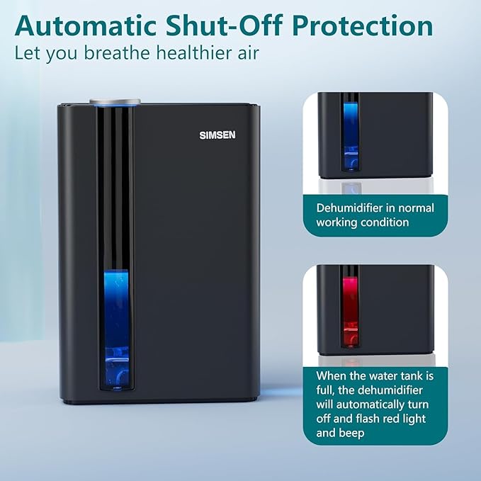 - 【Auto Shut-off】 SIMSEN dehumidifier have auto shut-off feature prevents leaking or overflow when water tank is full. The red indicator flashes to remind you to empty the tank. Its auto-off function makes it be safe to use even when you are not at home. The dehumidifier is also equipped with a drain hose, which allows the dehumidifier to automatically and continuously drain water, eliminating the need to empty the water tank all the time.