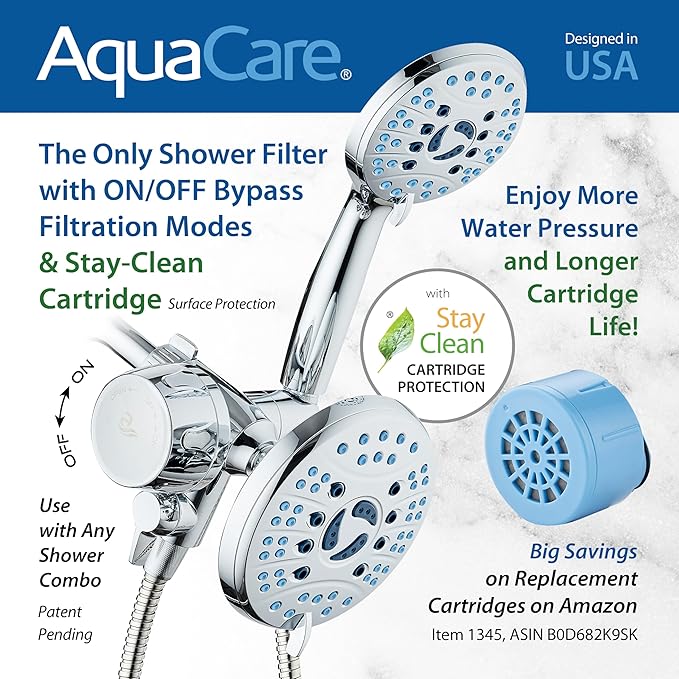 - Revolutionary ON/OFF Bypass Mode - AquaCare is the only Shower Filter that lets you turn it ON or OFF when needed. By directing water flow to bypass the filter cartridge during lathering, shaving, or bath cleaning applications, you can enjoy greater water pressure and longer cartridge life. It works with any new or existing shower combo and connects in minutes without tools.