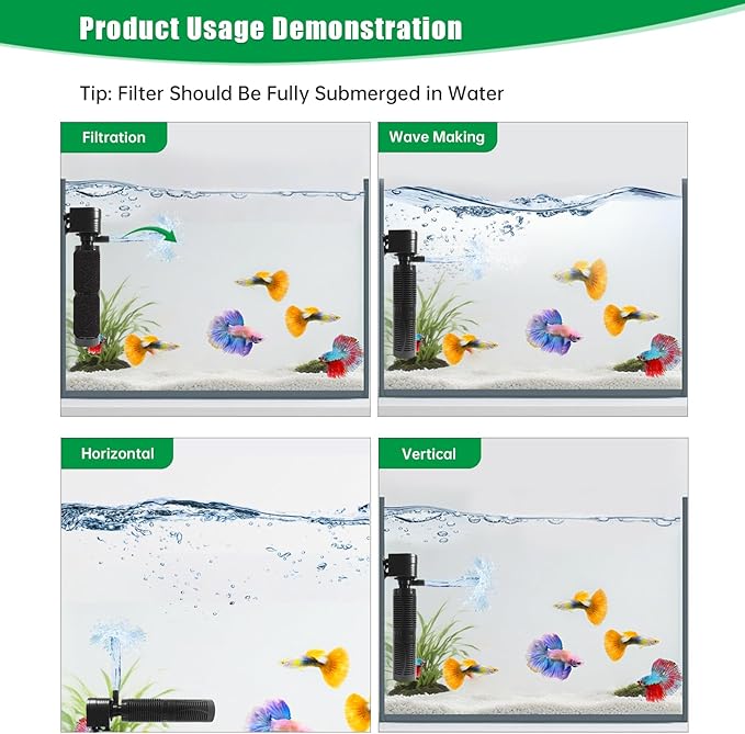 - Quiet Operation, Fully Submersible Design (<35dB): Built with a low-noise motor and anti-vibration suction cups, this sponge filter delivers quiet performance — ideal for bedrooms, offices, or other peaceful environments. Fully submersible and designed for flexibility, it also supports lower water levels for creative tank setups.