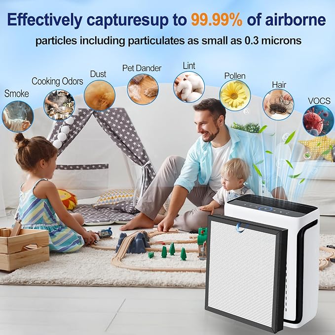 - 🌿 Triple-Layer Defense for Cleaner Air: Combines a washable pre-filter (traps pet hair/lint), medical-grade True H13 HEPA (captures 99.97% of 0.3-micron particles like pollen and smoke), and enhanced activated carbon to neutralize stubborn cooking smells, pet odors, and VOCs.
