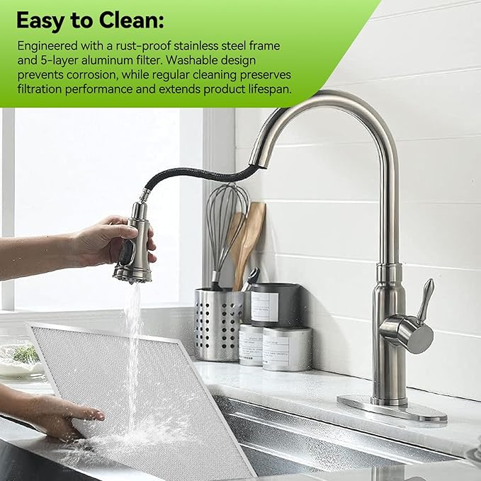 - Usage:Remove or add specifics: "Featuring upgraded 304 stainless steel edges and a five-layer aluminum filter, effectively trapping grease and reducing kitchen odors.