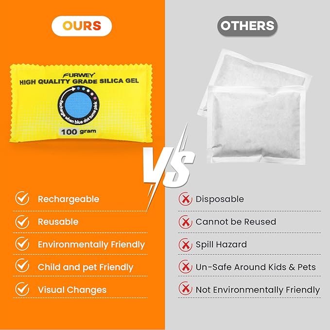 - Humidity Indicator Light Design: Our desiccant packs are equipped with a color changing window, which is blue before use. After receiving the goods and opening the transparent bag, it can be used directly. When the color changes to light pink, it needs to be charged. Once charged, it will turn blue again and allow for continued use.