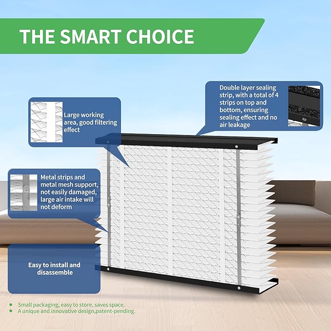 - Easy to install: Quick and easy filter replacement process requires no special tools or technical expertise.Unpack, Unfold the filter, Slide in, Close the door, It's done, without aligning the upper and lower Interlock Rail System, No assembly cardboard or metal strips and screws.This innovative design offers a significant improvement over traditional filters.