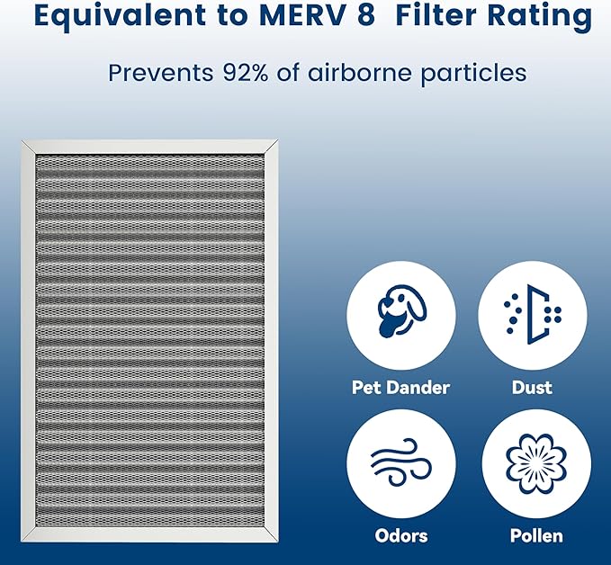 - 【Work efficiently】Our air filter replacements use static electricity to remove particles like lint, dust and pet dander from the air. MERV 8 - Best for furnace, A/C, central HVAC systems.