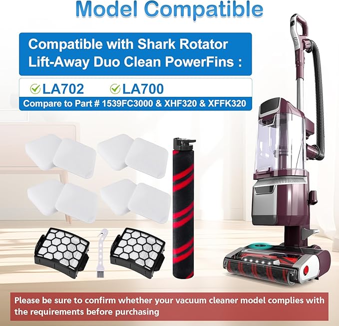 - Tailored Fit: Only Designed specifically for Shark Rotator Lift-Away Duo Clean PowerFins LA702, LA700 vacuum cleaner. Compare to Part # 1539FC3000 & XHF320 & XFFK320. Please verify your vacuum model before purchasing to ensure proper fitment