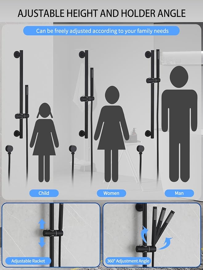- 【Adjustable Shower Slide Bar】The adjustable shower head bracket allows you to adjust the height and angle of the handheld shower head after installation. This feature is convenient for kids and adults, washing pets, and even showering while seated, providing the perfect shower experience for every family member