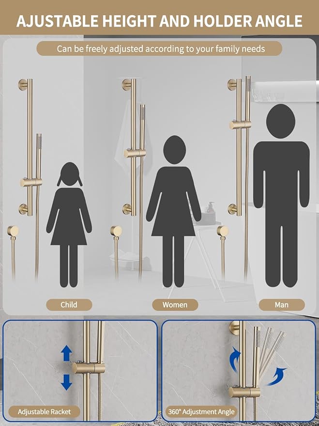 - 【Adjustable Shower Slide Bar】The adjustable shower head bracket allows you to adjust the height and angle of the handheld shower head after installation. This feature is convenient for kids and adults, washing pets, and even showering while seated, providing the perfect shower experience for every family member