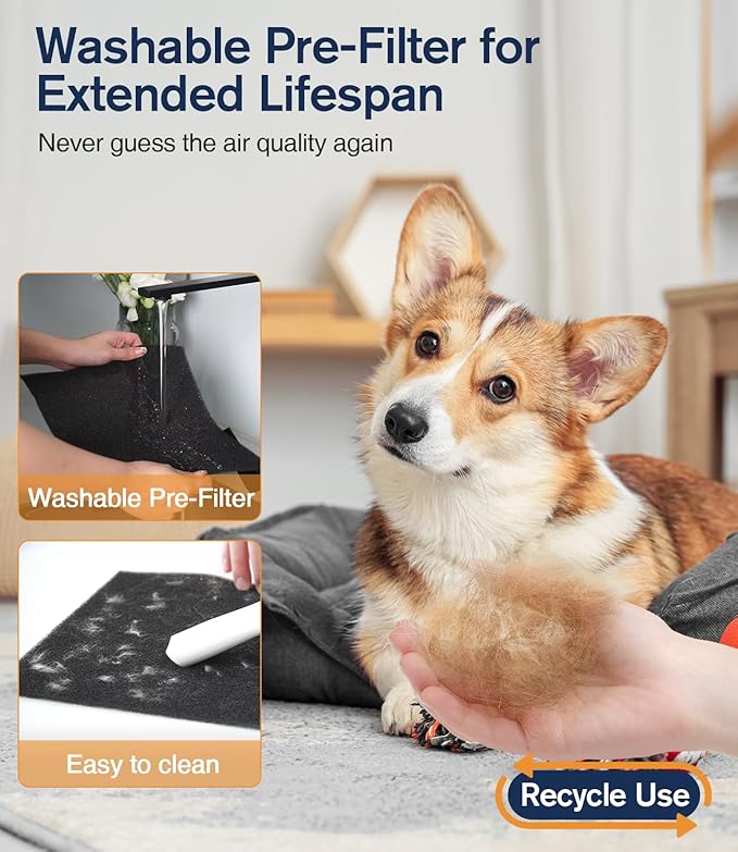 - WASHABLE FILTER FOR PET LOVERS: The air purifiers for home large room have 2x H13 HEPA filters that can effectively filter airborne particles as small as 0.3 microns, such as pollen, dust, and pet dander. The pre-filter of this pet air purifier can be cleaned by vacuuming or washing to extend its service life. Upgraded dual-layer activated carbon filter with 112.5% more activated carbon particles to help absorb odors such as pet odors, smoke, and VOCs. A great choice for pet lovers!