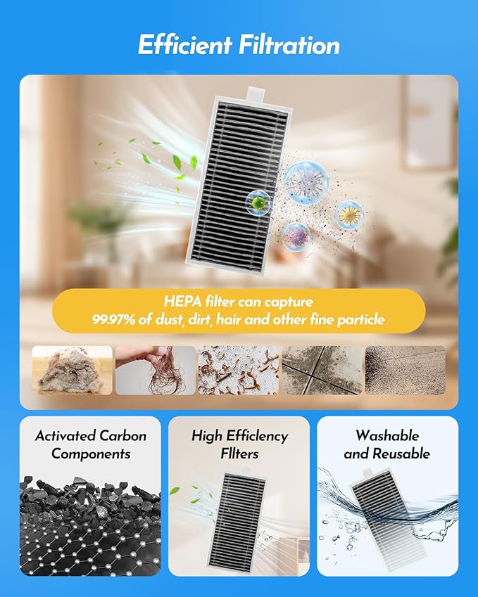 - 【PACKAGE INCLUDED】1 Main Brush, 4 Side Brushes, 4 HEPA Filters, 4 Dust-Bags, 2 Roller Brushes, 1 Cleaning Brush.These high-quality replacement parts help maintain your vacuum robot's efficient operation