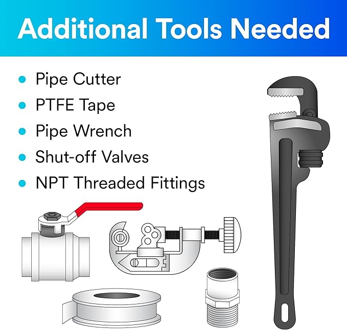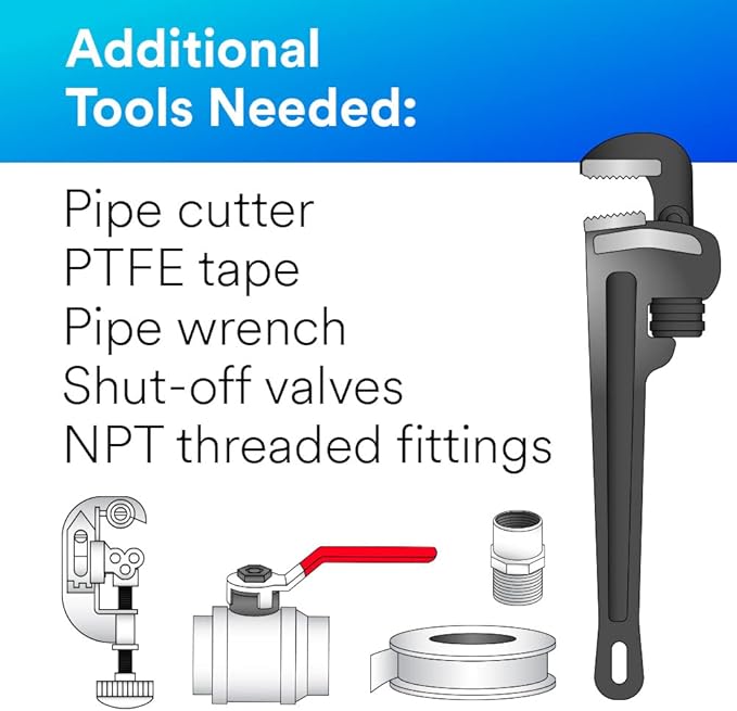 - System is to be installed on cold water line feeding water to the water heater. Included System Head fittings are two 3/4" NPT (female) connections. Additional parts and tools are required for installation and not included
