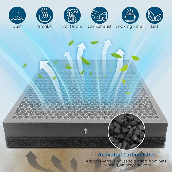 - PREMIUM FILTER: Our Puro 400 air filter replacement part features an activated carbon filter helps absorb airborne particles as small as 0.3 microns, up to 99.97% efficiency, and an activated carbon filter that helps tackle unpleasant odors and gases. It's an ideal choice for smokers, pet owners, pregnant women, allergy sufferers, or those with open-style kitchens at home, making it easy to improve your air quality