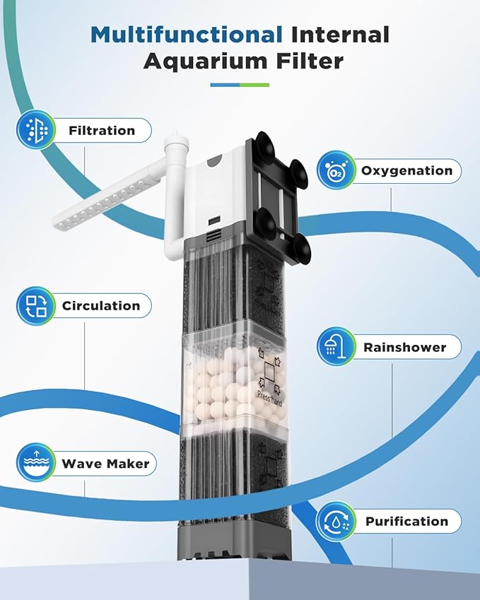 - Effective Filtration Aquarium Filter: AQQA aquarium filter with rainshower pipe design. Physical filtration-filtering coarse particles, while the quartz balls focus on biofiltration-cultivating beneficial bacteria to break down harmful substances in water. Filtration & Wave Maker & Water Circulation & Purification, provide a excellent and clean tank for aquatic life.