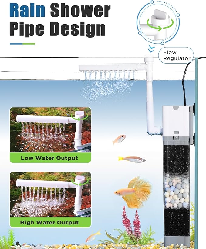 - Adjustable Water Flow: The fish tank filter designed with a flow regulator, it can adjust the water output of the rain shower pipe easily. Tip: The pump is located at the top of the filter. Please ensure that aquarium filter is completely submerged in water when using.