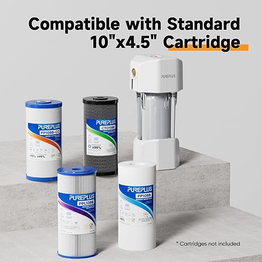 - Enjoy Flexibility with Standard Cartridges — Compatible with all 10″ × 4.5″ filter cartridges, including sediment, carbon, and pleated types; easily customize your filtration to meet your family’s needs.