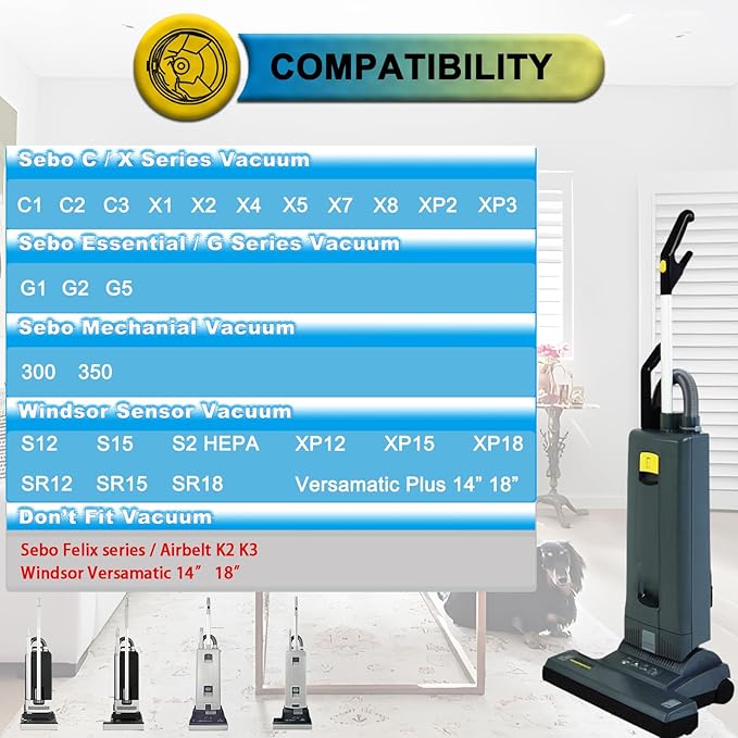- Compatible With Sebo C/G/X Series Upright Vacuum Cleaners: C1, C2, C2 Total, C2.1 Green, C2.1 Red, C3, C3.1 Blue, C3.1 White, Essential G1 G2 G5, Automatic X1, Automatic X4, Automatic X4 Pet, AUTOMATIC XP2, Automatic XP3, X1, X1 Grey, X1 White, X2, X2 Grey, X3, X3 Grey, X4, X4 Blue, X4 Extra, X4 Pet, X4 White, X5, X5 Blue, X5 Extra, XP2, XP3 & 300/350 Mechanical ,370 Comfort Upright Vacuums.