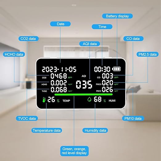 11-in-1 Air Quality Monitor, Indoor CO2/VOC/AQI/PM2.5/Thermometer/Humidity Monitor, Portable Smart Air Quality Meters, Air Quality Tester for Home Office Outdoor, Battery Powered (White)