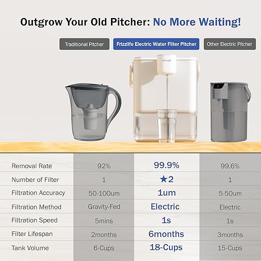 - ใ1-Micron Dual-Filter Tech - Removes 99.9% of Contaminants | Keeps Healthy Mineralsใ-- Frizzlife MD40 innovative water pitcher features two pre-installed 1-micron filters that work together to remove 99.9% of contaminants including chlorine, lead, fluoride and PFAS, PFOA/PFOS while preserving essential minerals for better-tasting water. Unlike standard single-filter pitchers, our Dual-Filter technology provides superior purification - the perfect balance of clean water with minerals intact. The BPA-free design ensures complete safety for your family.
