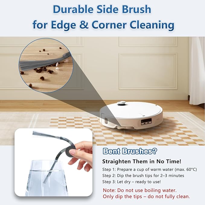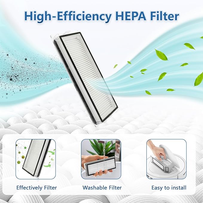 - 【Main Brush & Side Brush& Fliter】The main roller brush and side brush are made of high-quality ABS rubber can efficiently collecting fine dust and dirt, reducing hair tangles.The filter is made of H13 grade filter paper, it can filter 99.97% of your unwanted dust debris.