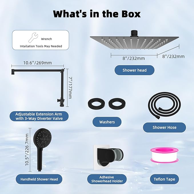 - Easy to Install, No Plumbing Needed: Experience the convenience of our DIY-friendly shower set with US standard 1/2'' pipe threads. No need for a plumber or handyman; install your new shower head in minutes. The rainfall shower head with handheld combo includes a 8-inch large square shower head, a 10 spray handheld shower head, a 71-inch metal stainless steel shower hose, a 16-inch shower head extension arm, an adhesive shower head holder, washers, Teflon tape, and an installation manual