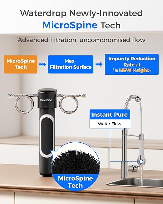 - γReduces 80+ Impurities, Safer WaterγTested by a third-party lab, this under-sink water filtration system effectively reduces chlorine, fluoride, PFOA, PFOS, pesticides, sediments, and more impurities. Meanwhile, Waterdrop's exclusive MicroSpine filtration technology ensures cleaner, fresher water for your family every day.