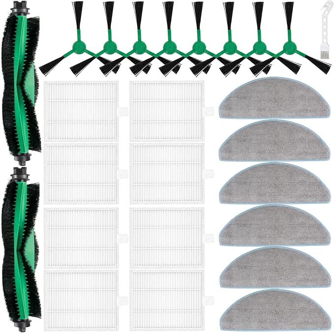 - The package offers a comprehensive 2 Main Brushes, 8 Filters, 8 Side Brushes, 6 Mop Pads,1 Cleaning Brush