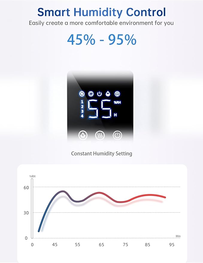 - 【Auto Shut-Off & Smart Humidity Control】Engineered for safety, the large humidifier automatically turns off when water runs low. Its intelligent constant humidity feature lets you set a target level between 40% and 90% RH (in 5% increments). The room humidifier maintains your desired climate automatically, promoting healthier air year-round.