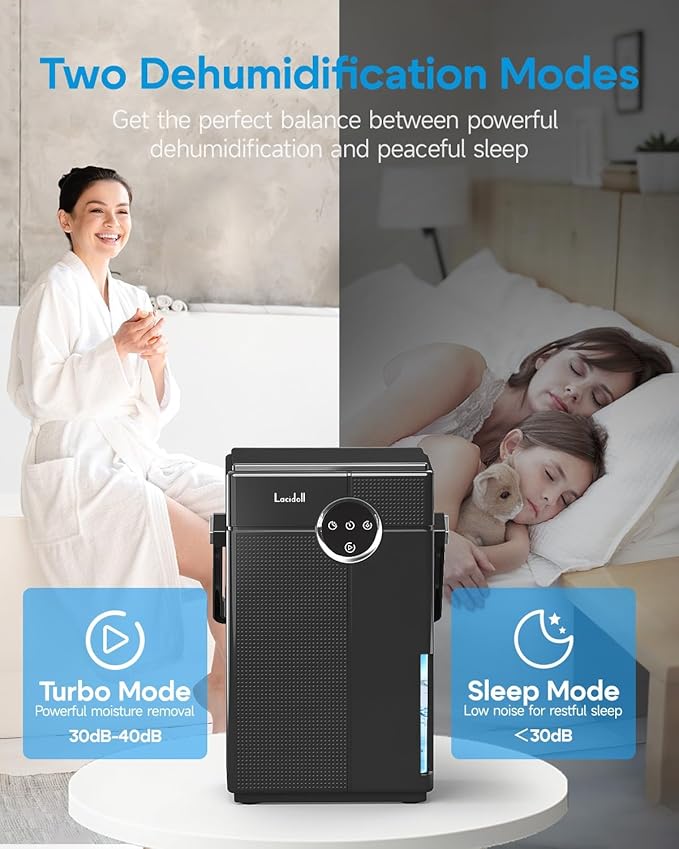 - 【Powerful & Whisper-Quiet Dehumidification】Featuring dual-semiconductor technology and dual air outlets, Lacidoll dehumidifier with drain hose removes moisture 2x faster, extracting up to 40oz of moisture per day (tested at 86°F, 80% RH) and effectively covering areas up to 800 sq. ft. Unlike traditional compressor dehumidifiers, our dehumidifier for bedroom come with an ultra-quiet 30dB sleep mode, ensuring a peaceful, undisturbed environment while keeping humidity at bay.