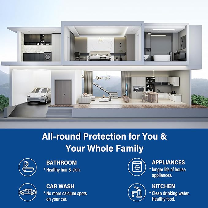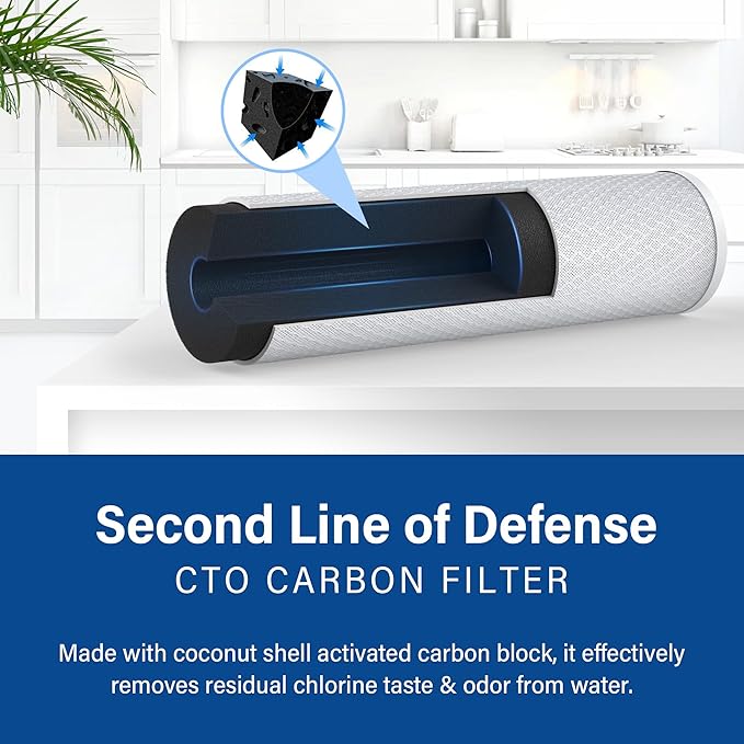 - Second Line of Defense: Comes with the CTO Filter made from activated carbon which effectively residual chlorine, discoloration, odors, and fine suspended particles from water. The CTO filter contributes to better overall water quality and makes the water clearer, odorless, and with a better taste, which is crucial for drinking, cooking, and other household uses, especially for improving water quality in old residential areas.