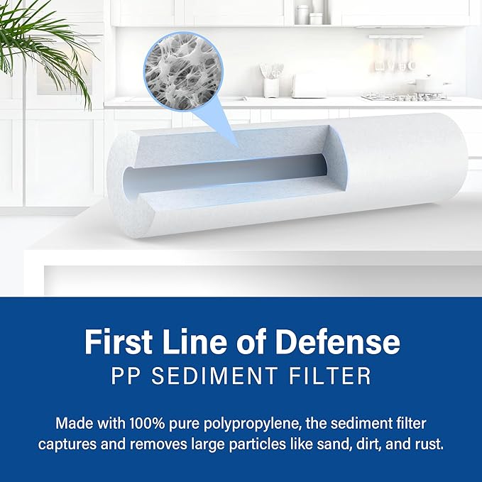 - First Line of Defense: The 1st stage 5 micron sediment filter captures and removes large particles like sand, dirt, and rust. This essential water filter cartridge prolongs the lifespan of your appliances by preventing debris from clogging your plumbing. Captures sediments like rust, dust, silt, and dirt which reduces water cloudiness and turbidity, thus protecting and prolonging life of stage 2, stage 3 filters.
