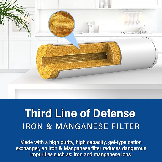 - Complete 3-Stage Whole House Water Filter Set: Packs as a complete set, saving you time and effort in sourcing individual filters. The versatile 3-stage water filter set consists of the basic water filters: PP Sediment Filter, CTO Carbon Filter, and Iron & Manganese Filter. All water filters are tested by an independent third-party to meet NSF/ANSI standards and have a capacity of 100, 000 gal. of water, enough to supply a family of four with clean water for a full year.