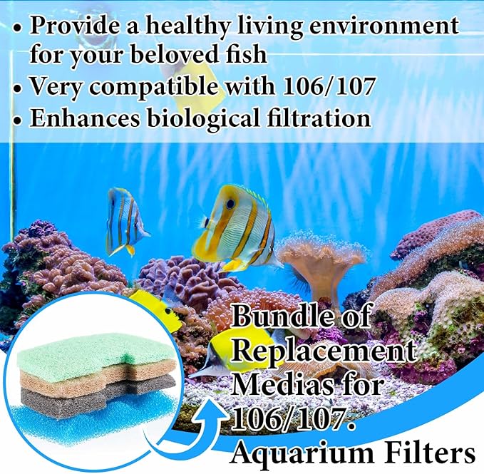 - Package Contents: a total of 40 fish tank filter media compatible with 106/107, including 4 pieces biological sponge, 12 pieces ammonia remover, 12 pieces phosphate remover, 12 pieces nitrite remover; This ample supply ensures long term effective functionality