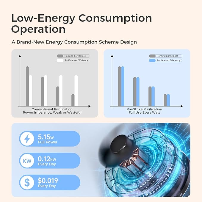 - Low Energy Consumption: We always care about your electricity bills. Our purifiers under ATUO mode consume less electricity while providing the same purification effect. Even at full power with a 4-speed fan, the daily electricity cost is only US$0.019, which is lower than other purifiers.