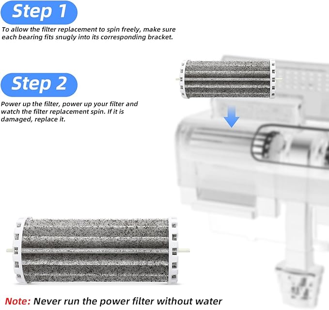 - Easy to Install: This fish tank filter replacement does not require specialized tools and complicated operations, just make sure each bearing fits firmly and it can be installed in place. Please note that you should never run the power filter without water, and observe whether the biological wheel runs normally during operation.