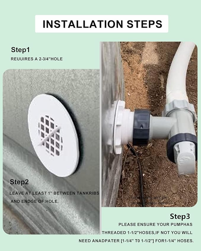 - Installation Tips: First, a 2-3/4in(5.08-1.91cm) hole is required. Second, leave at least 1in/2.54cm between the tank's reinforcement and the edge of the hole. Third, make sure your pump comes with a 1-1/2in(2.54-1.27cm) threaded hose. If not, you will need a 1-1/4in to 1-1/2in(2.54-0.64cm to 2.54-1.27cm) adapter for a 1-1/4in(2.54-0.64cm) hose.