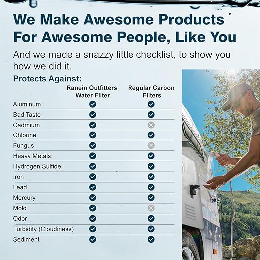 - 【Safe Water】Bid farewell to disagreeable flavors, smells, chlorine, sediment, and beyond. This RV water filtration system showcases GAC filtration coupled with KDF, managing bacteria and mold proliferation during periods of filter inactivity.
