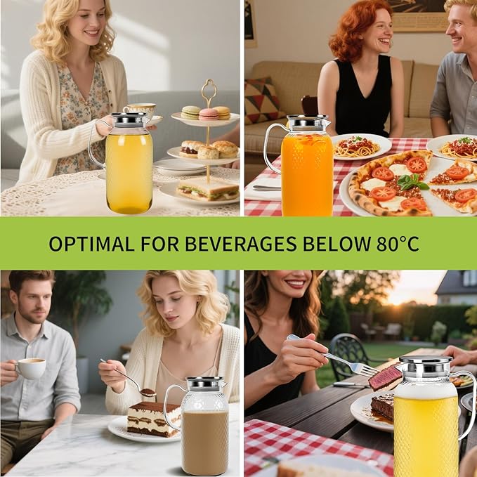 - Temperature Versatile: Safely store cold drinks and warm beverages under 80°C (176°F), perfect for iced tea, juice, coffee or infused waters; the clear body showcases fruit, herb additions beautifully, ideal for home, office or gatherings