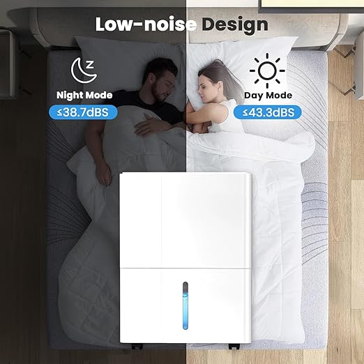 - Enjoy the peace you deserve. Operating at a whisper-quiet <50dB (quieter than a standard refrigerator), this dehumidifier won't disrupt your sleep, work, or TV time. Its 360° smooth-rolling caster wheels and ergonomic carry handle make it incredibly easy to move from a damp basement to a humid bathroom or a stuffy bedroom—no heavy lifting required. Its compact and lightweight design stores away easily when not in use.