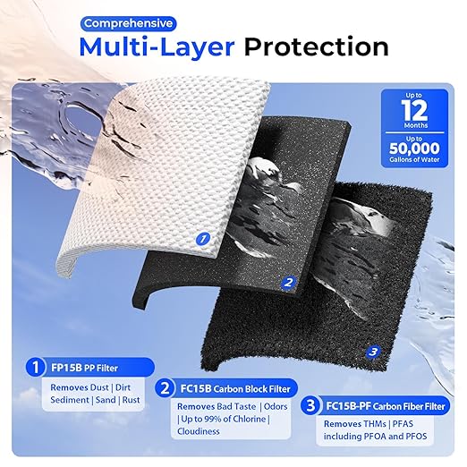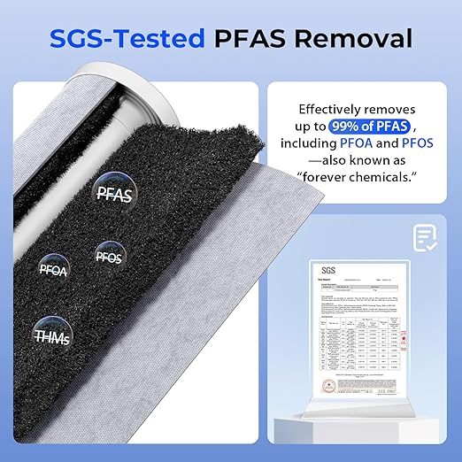 - PFAS-Free Water for Your Whole Home β Built with an SGS-tested FC15B-PF PFAS-removal filter, this compact whole house water filtration system removes up to 99% of PFAS, including PFOA and PFOS, found in municipal and well water. A reliable PFAS water filter for families seeking safer water throughout the home.