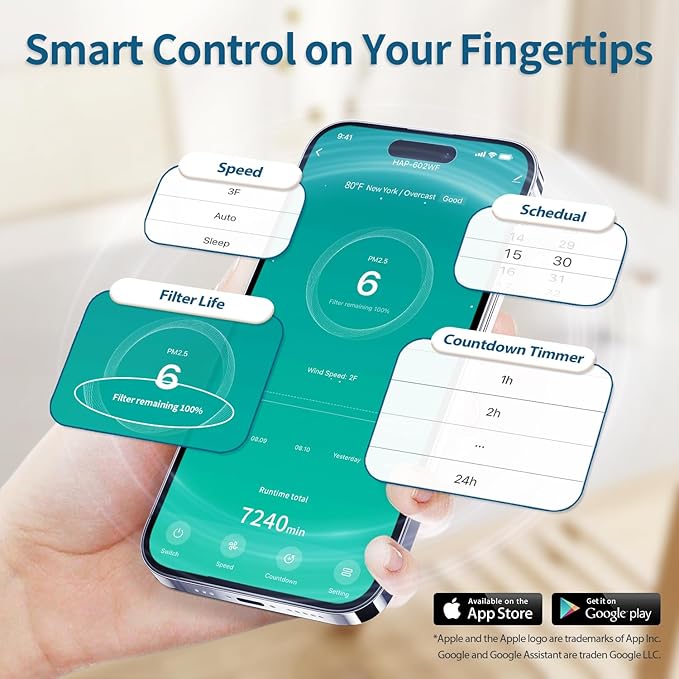 - Smart Control: With the free Ecoself app, you can effortlessly manage your air purifier settings, set timers, create schedules, monitor filter life, and connect to third-party voice assistants. Enjoy the convenience of controlling your air quality right from your smartphone!
