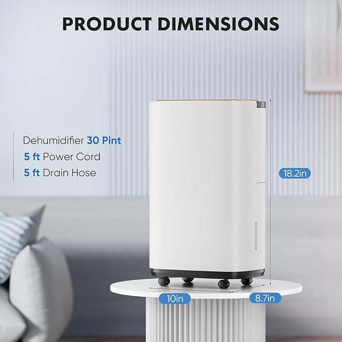 - [30 Pints/24 Hours with 4.9 ft drain hose] The Sweetcrispy dehumidifier with drain hose delivers excellent performance by extracting up to 30 pints of moisture daily, making it an ideal basement dehumidifier and a powerful dehumidifier for home use. With a coverage area of 2000 sq ft, this unit performs efficiently as a whole house dehumidifier, effectively reducing humidity in large rooms, bedrooms, and bathrooms. Its superior capacity also qualifies it as one of the most reliable dehumidifiers for basements with drain hose compatibility.